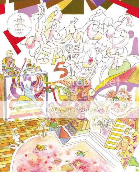 The Lute String, originally published as a standalone book in Japan, is Woodring's most sustained Frank story of recent years, though Frank himself (the amorphously anthropomorphic hero of many Woodring sagas) is only a peripheral figure here. Instead, the focus is on Frank's friends, Pupshaw and Pushpaw, both of whom somehow look like a fusion between a puppy and a small cottage. Like all of Woodring's Frank comics, this one is wordless, and its meaning ambiguous: these stories are like abstract parables, teaching moral lessons through Woodring's selfish, curious, mystically oriented characters. In this case, the moral seems to be: no matter how important, how powerful, you think you are there's always something greater, always someone or some force beyond your control. It's about life as a hierarchy stretching up into some infinite unknowable place. Just as Frank playfully intervenes in the struggle (or mating rite?) between two miniature insect-like creatures, and Pupshaw and Pushpaw delight in terrifying a little morphing hippopotamus, an elephant-like deity eventually intervenes into their plane of reality, sending the two pups off into a strange, frightening alternate dimension: our own world. While there, the two "dogs" wind up mutually scaring and scared by a pair of human children and a songbird, before they're brought back to their own world, newly appreciative of its special wonders and pleasures. All of this is conveyed without words, with Woodring's stylish, detailed imagery and distinctive wiggly hatching. It's moving, funny, and as with all of Woodring's work it demands a close reading.